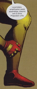 The boots have locomotory amplification pedal assemblies, bosonic anti-G drive, and propulsion units.