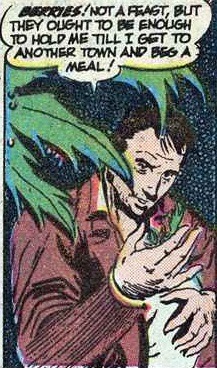 Lowry left the police station and wandered into the wilderness just outside of town--all along the way, the hobo thought of how he hated Haysville and its selfish people, and of how much he'd like to get even with the town. When he was deep in the woods, Lowry found a strange looking bush with berries--although they were hardly a feast, he figured the berries would satisfy his hunger until he reached the next town.