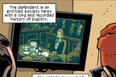 (Daredevil III#31 (fb) - BTS) - District attorney James Priest received praise for his aggressive prosecution of a woman, Bainwood, on trial for killing an unarmed black teen.