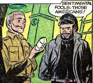 At 12.09 AM, Reuger was in the the cabin of the U-boat's captain--when he saw the wrapped present that White had given to Reuger, the captain mockingly commented that Americans were sentimental fools, and Reuger laughingly retorted that he'd never met a more sentimental or foolish American than Eddie White! But when the psychic saboteur unwrapped the gift, he stared at it for a few seconds in disbelief, then uttered a startled cry--it was the time-bomb Reuger had left in the munitions factory, and it was set to detonate in seconds!