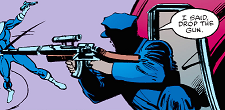 (Daredevil I#181) – When Bullseye was escaping from prison, with hostage Tom Snyde, guard Lou leveled at gun at him from a helicopter but Bullseye threw a gun at Lou, knocking him to the ground below and seemingly killing him. Bullseye then escaped on the copter.