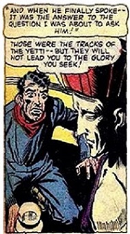 "Tucker" made his way to the Himalayas, and he used the stolen maps to locate the area where the most numerous Yetti sightings were made--it was no easy task climbing the mountains alone, but the thought of the rewards that awaited him gave him the strength to carry on. Along the way, "Tucker" became lost in a blizzard, and he began to weaken in his drive for glory; but when the storm subsided, he came upon a monastery, and new hope arose in him when he saw huge footprints in front of the structure. An aged Lama came out of the monastery, and he took "Tucker" inside the warm temple to feed him--as "Tucker" hungrily ate, the Lama sat silently watching him, and "Tucker" felt that the Lama's eyes seemed to read every wrong deed that he had ever done.