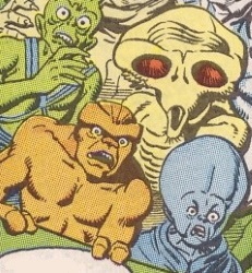 Finally, six of the eight minions resemble some of the Thanos-thralls who appeared in a symbolic group shot from Captain Marvel I#31 (see below). Those six were a Badoon, a Skrull, a Xeronian, a bald humanoid with a clear helmet around his head, an armored humanoid (presumably a divergent Reality-616 version of one of the Emissaries of the Overlord) and a yellow-skinned minion who looked like a member of the semi-humanoid race that resembled costumes once worn by the Tinkerer and his men. The two minions who did not appear in CM#31 were a Monster of Badoon (named Joonvit) and a Shi'ar.