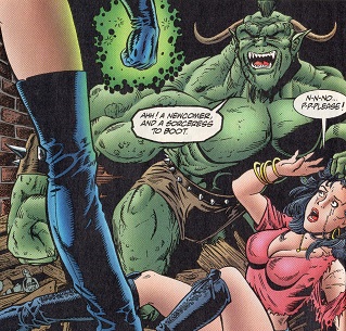 (Mantra II#6) - As Ajak-Kar assaulted a young woman in Canoga Park, California, on that weekend's Sunday night, Mantra (Lauren Sherwood) heard the woman scream and flew to her rescue. Ajak-Kar was pleased to encounter a sorceress, and when Mantra blasted him off his feet, he noted this to be an interesting opening move.