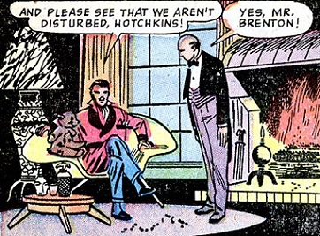 Strange Tales I#38/2, p2, pan4 (in the den of his mansion, Bradley Brenton sits in chair with teddy bear; Hotchkins (right))