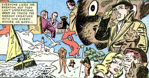 (Strange Tales I#38/2 (fb)) - Brenton and his teddy bear were inseparable, and--despite the scorn and ridicule of others--he always carried the shaggy old toy with him wherever he went. Whenever Brenton and the teddy bear didn't go out, they stayed in the den of Brenton's mansion far into the night, where the shaggy creature came up with ideas for Brenton to expand his business interests. When Brenton went to bed, he always took his teddy bear with him, just as he had done since he was a child.