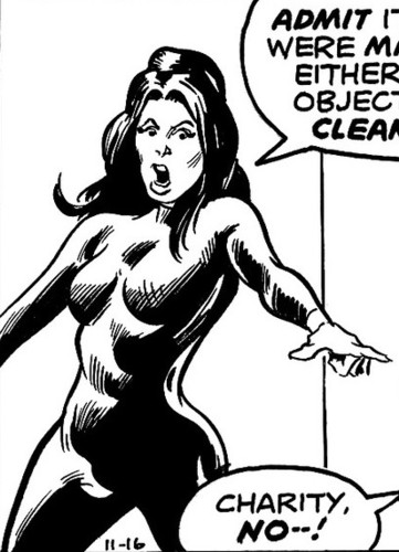 (Howard the Duck Newspaper Strip November 13th to December 11th, 1977) - Feeling slighted and wanting to be the first to gain a super body, Charity, along with Howard's insistence, convinced Fred Feenix to comply with the request. Gaining her new body, Charity then turned against Fred Feenix, accusing him of being just like any other man who saw women as inferior and stormed off by smashing her way through a wall and dropping five stories to the sidewalk below, vowing to rejoin her women's group, the Sixth Avenue Amazons, and take over as its leader. Fred, Howard, Beverly, and Arthur chased after her. The Self-made Man and Charity began a scuffle on the street, but he was unsuccessful in subduing her. Unable to resist any opportunity to humiliate her ex-husband, Charity bull-rushed Arthur and Charity crashed into a nearby business called the Eurasian Health Spa, where she got tangled up in an exercise machine that Howard then set to max causing intense vibrations that made her limbs fall off. Scooping them up, her body was returned to Fred's office where he promised to fix her at some later date. Her current activities are unknown.
