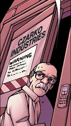 (She-Hulk II#2) - Arriving at Czarko Industries, Czarkowski set some random coordinates on his time machine and used his DNA scrambler so that the TVA would not be able to find him. Before departing, he sent a message to his past self, warning him of the impending attempt on his life. As he left the message, however, he realized that his scrambled self had the appearance of the man he had shot, and, in his shocked and confused state, verbalized that he was the one to kill Charles Czarkowski. After the message concluded and was sent, Czarkowski realized what he had done, and he prepared to send another message to clarify things to his past self.