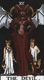 | The Death card (signifying transformation and major change) was represented by Nina Price (aka Vampire by Night). | The Temperance card (signifying healing) was consistently represented by the sorceress Topaz. | The Devil card (signifying one's darker side) was represented by Satana and ... | ...Daimon Hellstrom, each one out of every two readings. |