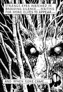 (Hulk Comic#26/2) - When two of the elves, Moondog and Buckthorn, ventured away from camp into the trees to get firewood, the trolls snared them with growing vines that wrapped round the pair and lifted them into the air. The trolls waited a while to see if more elves would present themselves as easy targets, and when none did the trolls decided to target the Black Knight, who was sitting vigil over the entranced Merlyn. The trolls snuck up on the Knight, but at the last second he sensed their approach and swung round to see one of the hideous creatures almost upon him. Momentarily shocked, he was struck down by a savage blow from the troll,
