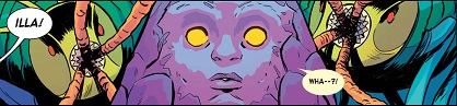 When Lunella compared Illa to a dog with fleas, Illa confirmed that she had giant flea-like creatures living on her, but Devil and Lunella drove off the creatures. Needing some space from the erratic, Lunella flew herself and Devil away from Illa in the Moon Mobile, despite Illa's screams of protests, which overloaded the Moon Mobile's engine; as a result, the Moon Mobile delivered Lunella and Devil to "Earth-17885." (Moon Girl and Devil Dinosaur#21) - When Lunella and Devil returned to Illa in the Moon Mobile, Illa told them that she was very mad at them, but that she would show them that she could forgive them...but that they could never leave her again. |