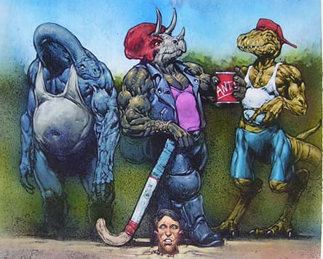 dinosaurs relaxing with a severed human head and some beers while Kether