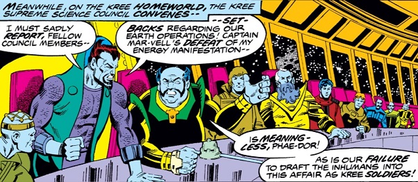 (Inhumans I#3) - When the Kree empire was involved in the War of the Three Galaxies, the Science Council was led by Phae-Dor. The Kree empire decided that the Inhumans had become too dangerous as weapons and had to be taken back into the empire to serve it for war purposes. The Inhumans had lived on Sol III (Earth) for millennia, but the Kree empire still considered them little more than slaves as the Kree had created them.