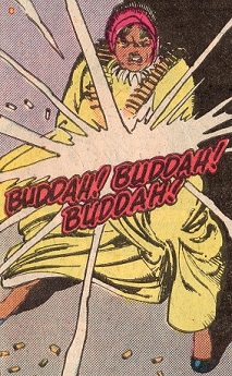 Moon Knight's immediate departure. Instead, Moon Knight hurled crescent darts that knocked over the braziers, plunging the chamber into darkness. Moon Knight swiftly dropped Jomo and Donny, who thus failed to answer Mother White's calls, and as Tilfred fled up the stairs seeking reinforcements, Moon Knight dropped him as well (presumbly in the pancake house restaurant itself). (Moon Knight II#6 - BTS) - In the ensuing conflict, Mother White's machine gun fire blew up the gas mains. Moon Knight and Lynora fled, the entire pancake housewas destroyed in an explosion, apparently killing those within it and its lower levels. (Moon Knight II#6 - BTS) - However, having escaped the explosion (presumably having departed the building prior to the explosion), Tilfred ambushed and slew Lynora in her apartment. Having heard of the survivor and arriving too late, Moon Knight's presence nonetheless caused Tilfred to run away in a panic, apparently tripping over Lynora, smashing through a window, and falling to his death. --Moon Knight II#6Note: The unidentified "son" with the sunglasses in the initial confrontation wasn't seen again, as far as I could tell... |