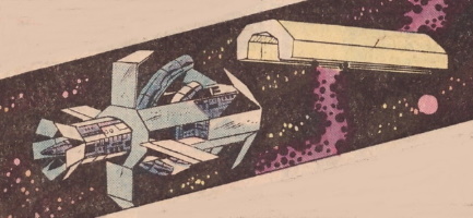 During the Nightwind's mission to Earth only three members of the tractor-beam crew were depicted on-panel and they, unlike most of the rest of the starcruiser's crew, seemed to belong to the same mechanical and/or cybernetic races of "Drones" as the crew of the space station commanded by the Primal One. However, unlike the "Drones" who had been enslaved by Maur-Kon and compelled to obey his Primal One construct, these "Drones" seemed to serve aboard the Nightwind as free beings.