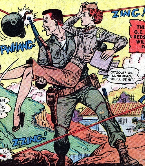 While O'Toole and Dave feasted on the left over food, communist forces rolled back into Chung-Pin to recapture the town. O'Toole noticed with some interest that the communists had a captured an US female nurse in their custody. Searching for equipment they could use to rescue the nurse, O'Toole and Dave found boxes of dynamite and women's clothing. O'Toole hatched a plan: he and Dave wold dress up as women then set the dynamite with a 10-minute fuse. By pretending to be women, they lulled two of the communist soldiers into following them out of sight of the other soldiers then punched them out, stole their uniforms and put them on. The two of them grabbed the nurse and stole off with her in an enemy jeep. The dynamite exploded to help cover their escape. As Dave drove, O'Toole seemed to have collapsed from a mortal wound so the nurse kissed him to make him comfortable. However, when they arrived back at headquarters, O'Toole revealed he had been carrying a bottle of ketchup which was struck by a bullet, soaking his uniform red. O'Toole and Dave were put in the guardhouse for being out of uniform. O'Toole simply relaxed and read an issue of War Comics.