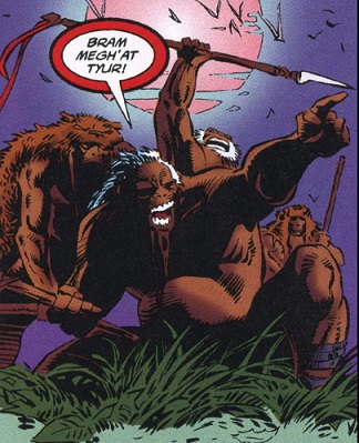 of the Pictish Isles to the East. With the Great Cataclysm circa 18,000 BC, the Pictish Isles arose from beneath the ocean waves, and the extensive island chain was heaved up to form the mountain peaks of the new continent later known as Novum Terra. The inhabitants of the islands were devastated by the upheaval of their continent, decimating much of the Pictish population, and they were forced to flee the great volcanoes upon the west coast that were once their beloved isles. Fleeing eastward, these now nomadic Picts migrated, driving the neanderthal Reindeer Men before them, until coming upon broad and rich plains far to the east. The Reindeer Men ventured southward to Terra Incognito, the former Southern Continent, but after centuries, the nomadic Picts were forced southward as the great ice fields came down from the Arctic, and after a great war, the Reindeer Men fled to the south of the continent. Traveling across a series of marshy islands that at that time had spanned the ocean, the Reindeer Men crossed eastward over to Kush, gradually wandering northward to an isolated location in western Thuria. While in the highlands of western Thuria, the Reindeer Men reputedly took command of the ancient stone fortress of Baal-dor, but they ultimately abandoned it. The nomadic Picts later sailed to one of the remnant isles of Atlantis and drove forth the remnant Atlanteans, they too making their way to western Thuria, where they waged savage warfare with the Reindeer Men dispatched there before them. The nomadic Picts eventually departed Atlantis, their journeys ultimately bringing them to the lands near the area now known as Cornwall, but after centuries, a conquering king forced most of them to sail for fertile plains by the far off cliffs that gleamed white in the sunlight. There the nomadic Picts again encountered the neanderthal Reindeer Men, now dwelling in caves, and the remnant Atlanteans, and drove both before them, the Reindeer Men fleeing to the forests and mountains of the remote north and west. Later from the dim lands of the north came the Kelts, bearing bronze swords and spears over the Pictish flint, their attacks driving both Pictish cultures before them, the nomadic and more "noble" Picts, who despite the decimation of and exodus from their homeland had retained a semblance of their noble culture, and a second drift of "savage" Picts, survivors of their Thurian colony that degenerated into barbaric savagery due to unending war with the Atlantean refugees. The two drifts of the Picts were reunited when they fled to the remote north and west mountains for a time, the barren lands where they had driven the Reindeer Men. The savage Picts eventually interbred with the Reindeer Men, redheaded neanderthal giants, causing them to degenerate as ages passed, becoming smaller and more brutish in stature and temperament over the millennia. --Savage Sword of Conan I#69/2 (fb), Savage Sword of Conan I#104/2 (fb); The Lost Race - BTS, Men of the Shadows - BTS, Legion From the Shadows - BTS, The Hyborian Age Note: So, I don't get the reindeer men...They were supposed to be red-haired and bearded Neanderthals, but they don’t look like that in the pictured image. Why were they called reindeer man? What do they have in common with reindeer? Why would giant Neanderthals mating with normal-sized people created 4-5’ tall people? --Snood They