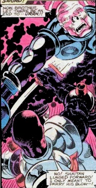 Fighting against his brother upon the inhospitable Shattered Plains, with each armed with a Force Hammer on the left arm and an Energy Blade in the right hand, Shaitan made the first strike. Taunting the king for growing soft, losing his emotionless edge after his time with the Micronauts, Shaitan appeared to have the advantage in combat.