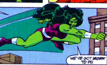 (Spectacular Spider-Man II#168) - "She-Hulk" told Spider-Man she needed help with a mission, and she lured him to an abandoned building owned by Wilson Fisk, then took him deep underground. Spider-Man and "She-Hulk" worked together to pry open an ancient tomb. Spider-Man pried open a box, releasing a black cloud (actually a swarm of insects), then "She-Hulk" dropped the lid, trapping Spider-Man beneath. Later, Space Phantom released She-Hulk, then stayed in hiding by taking on the form of a pigeon. Finally back in his true form, Space Phantom reported in to his benefactor, who refused to tell him what the black cloud was. Space Phantom prepared to launch his own agenda.