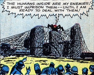 Without reason or purpose, the tiny spider happened to crawl into the path of the machine's atomic rays, and it was bombarded by the output. As its cell tissue was energized, the spider began to grow...and GROW...and GROW! Along with its body's expansion in size, the Spider's brain also enlarged, increasing its mental capacities, and giving it the ability to think and speak!