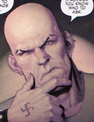 Joe was the bartender of the Westerner bar, somewhere in Arizona's Sonoran Desert. He was also a Neo-Nazi, a member of Hate-Monger's National Force and apparently a close friend of Tank. He was the first to encounter Frank when he entered the Westerner bar and didn't like how intense Frank was. He tried to calm down Frank because he was among friends at the bar. He drank a beer while Frank took down a bull as part of his initiation. He was shocked and impressed at the same time. Joe later joined Tank at the local police station where Tank forced the sheriff to tell him that Tatiana Arocha was the reporter that came to 911 operator Carla, who had been killed by Tank the day before. He later joined Tank in the kidnapping of Tatiana and hit Stuart Clarke before he drove off in fear. Joe and Tank both took a few shots at Stuart's car while he got away. They took Tati to the National Force's base and beat her up before presenting her to Frank to kill as part of his initiation process to join the National Force. Joe watched Frank kill Tati. Joe later took the wheel when the National Force drove to the next lay-up colony they planned to attack. He was in the same car as Frank and asked him what he had in his duffel bag. Frank revealed his new Captain America-inspired Punisher costume, before killing Joe and pushing him out the car. --Punisher War Journal II#7 (Punisher War Journal II#7-9 (fb) |