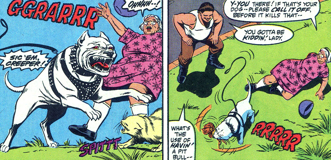 did not notice an approaching pit bull called Creeper. Egged on by its
