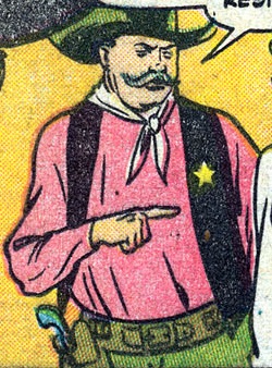 This somewhat portly sheriff was one of Ben Yarby's predecessors as lawman in Leadville. When Brush Bennett was rustling cattle, the sheriff came up with the idea of having the Lathrops prepare their cattle as bait so that he could catch them but instead Brush kidnapped Marie, leading to the Black Rider rescuing her. Later, when the people in Leadville were being frightened to death, the sheriff investigated but could not solve the case. The Black Rider ultimately found the deaths were caused by the Mad Messiah.