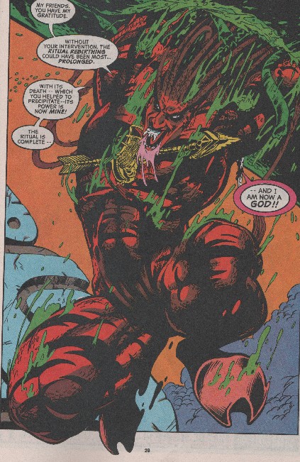 (Cage I#16) - While the heroes overcame their attackers, Priapus escaped, tracking the Carnal Serpent to the jungle of Venezuela, near Cerro Duida. There he found its temple, which he unlocked with the Tryst. The Serpent sensed his approach, and Priapus allowed it to consume him. The heroes followed Priapus to the temple of the Serpent, and battled and slew the Serpent. However, this was the step necessary for Priapus to complete the final portion of the ritual to attain the full power of the Carnal Serpent, and he tore free from its corpse, reborn yet again, now a god. Using his vastly amplified power, he enslaved the wills of the three heroes, forcing them to become his acolytes.