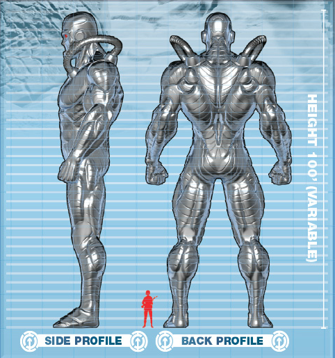 The source of his power is uncertain, but he is believed to be able to provide a virtually limitless supply of energy if properly tapped. Under certain circumstances he can absorb energy from outside sources to grow proportionately in size and power. His metal skin was adaptive to all attacks. At some point he gained the ability to shrink.
